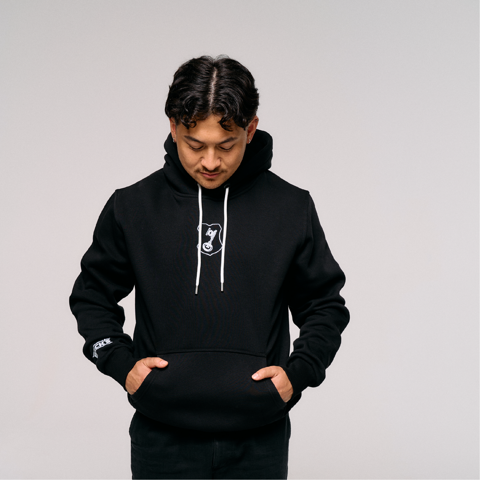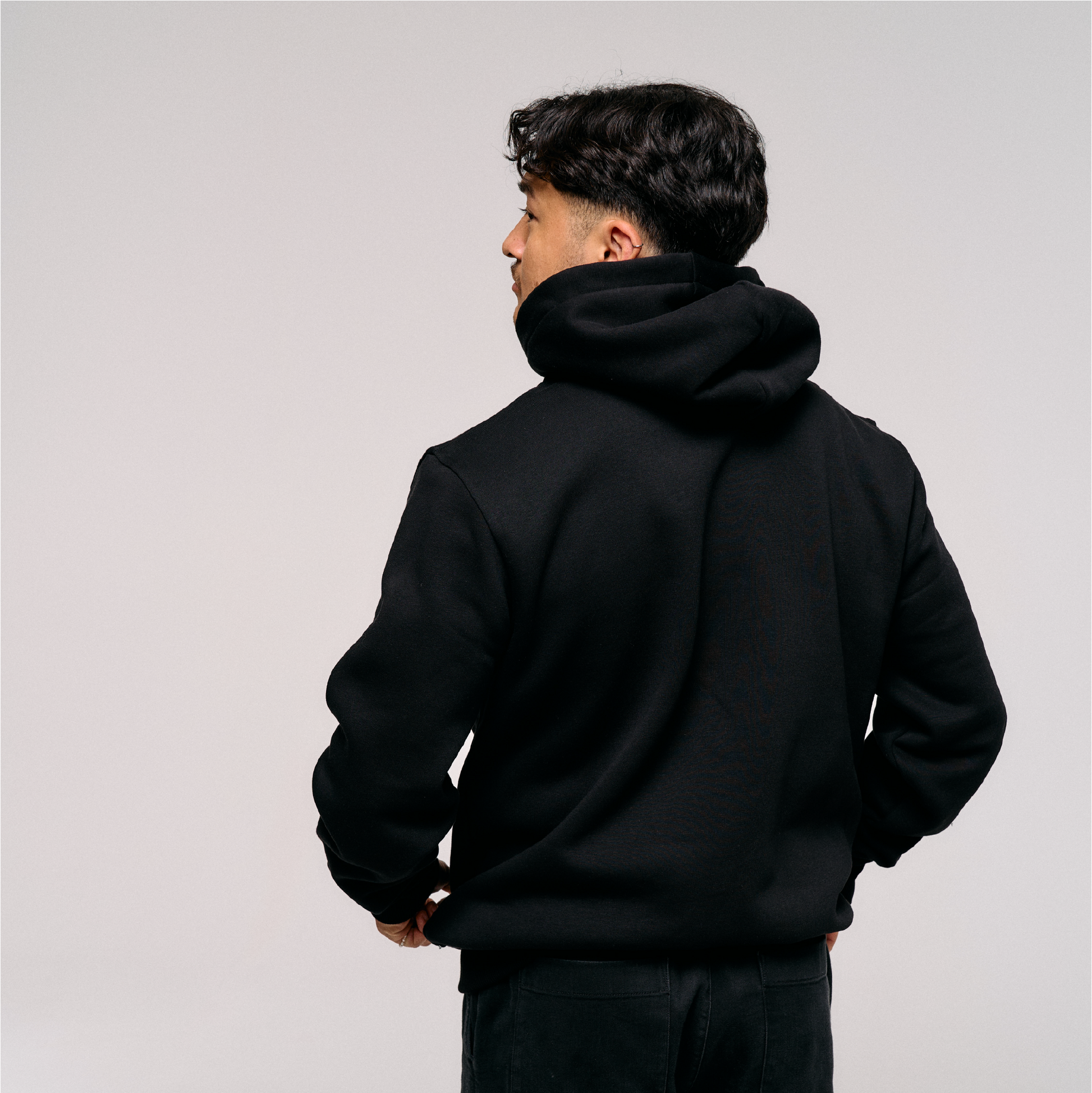 Schwarzer Hoodie mit 2 Bauchtaschen und Kapuze. Der Hoodie wird mit weissen Kapuzen-Bändeln ausgeliefert.