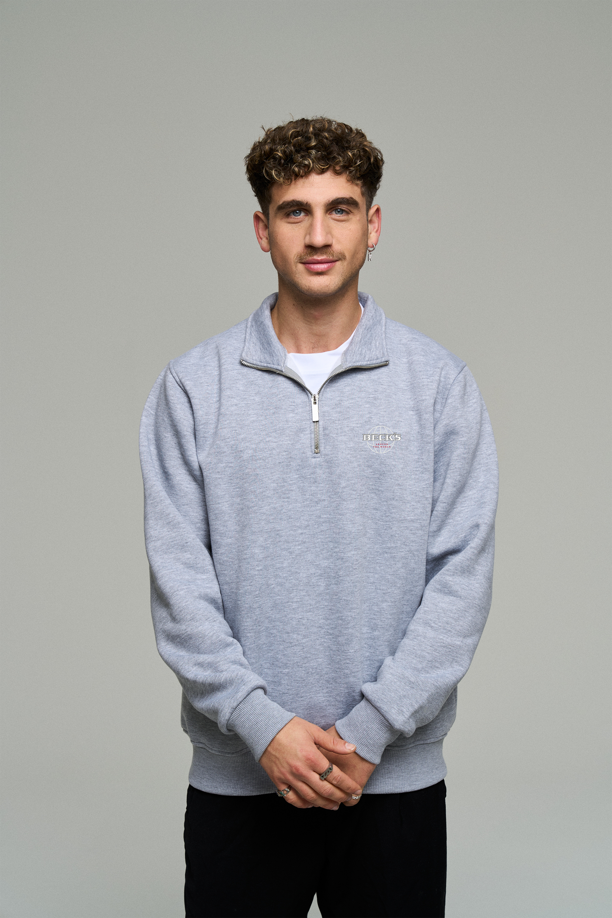 Grauer Half-Zip mit silbernem Reißverschluss.