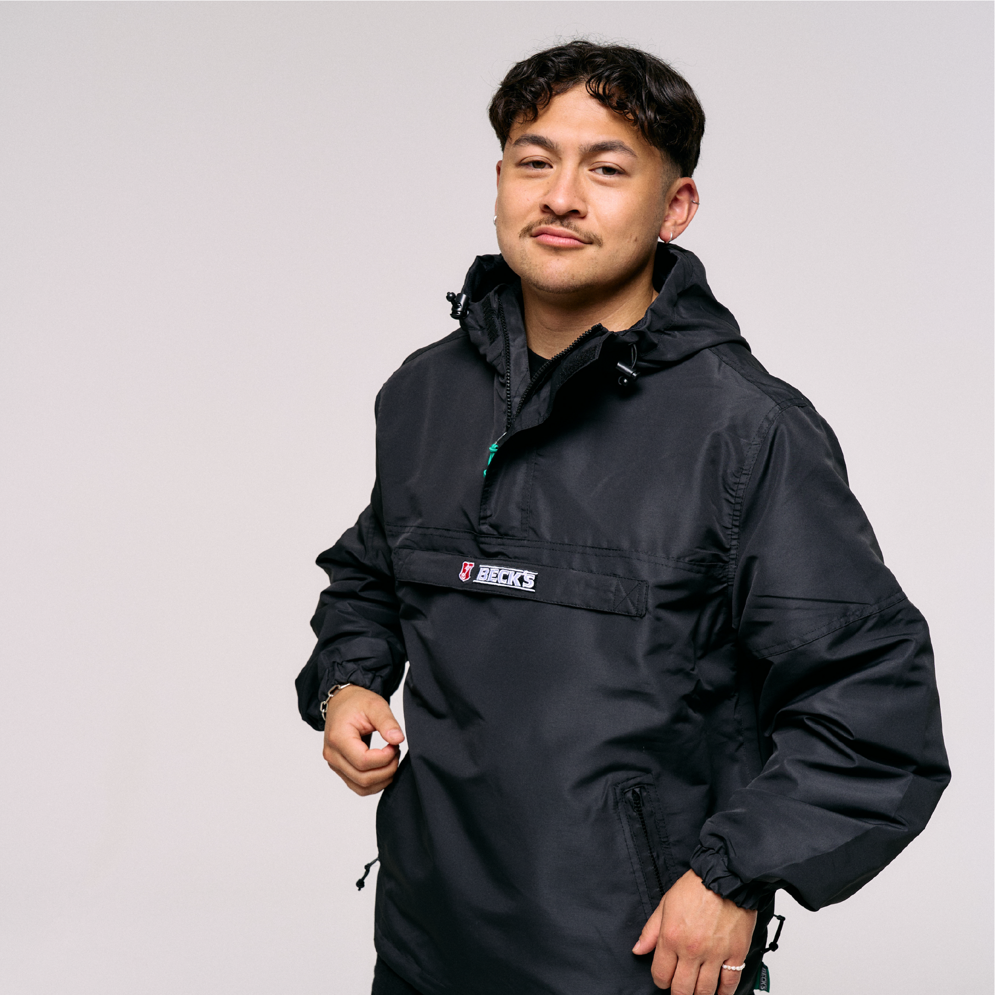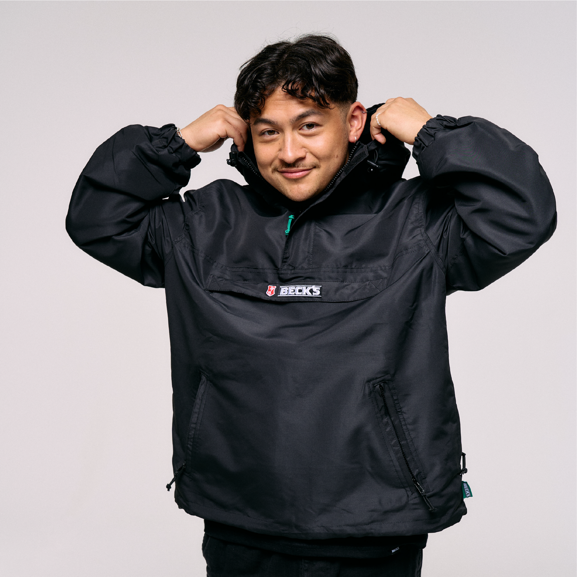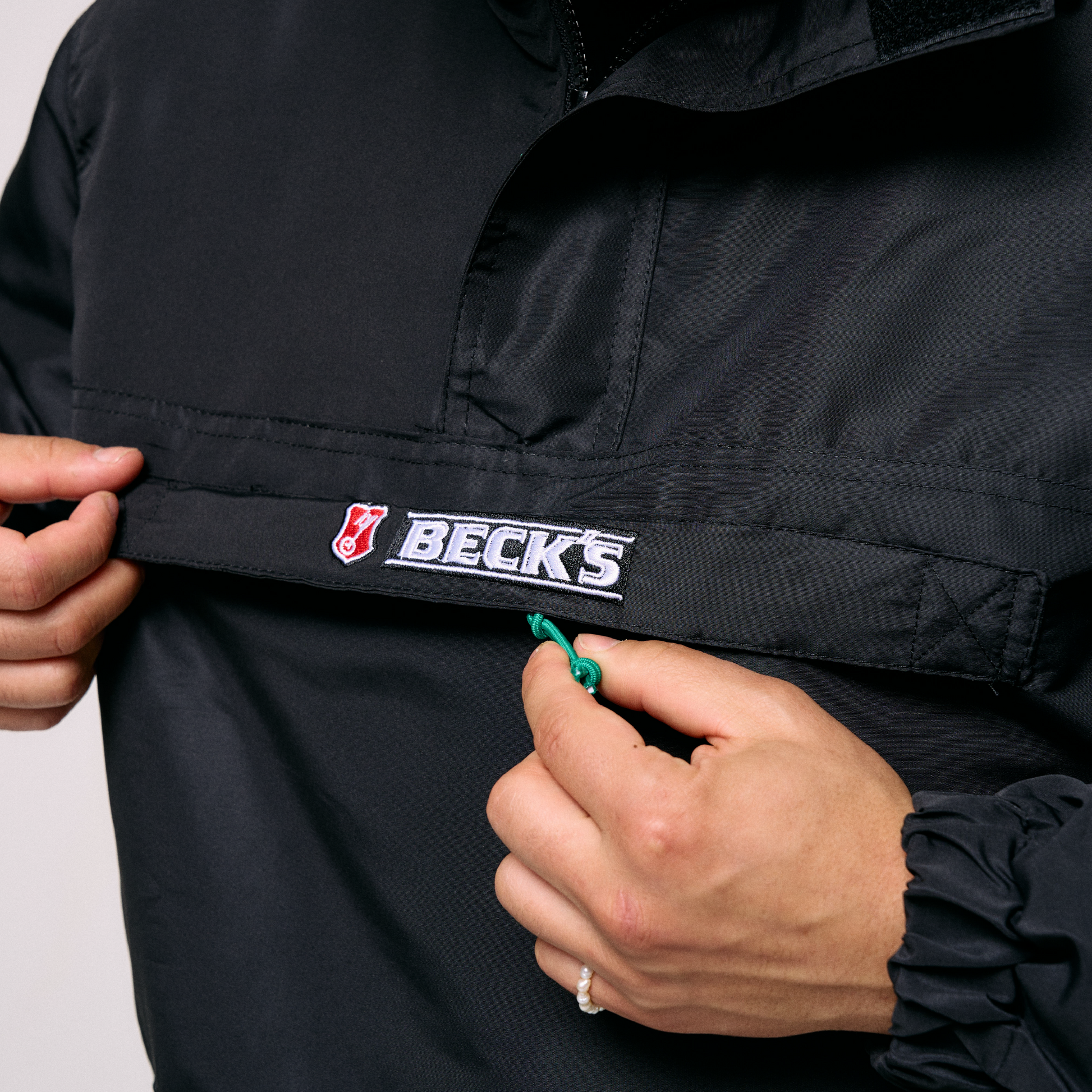 Der Beck's Windbreaker erscheint in einem schlichten Schwarz mit dem klassischen Becks's Logo und Schriftzug auf der Brust.